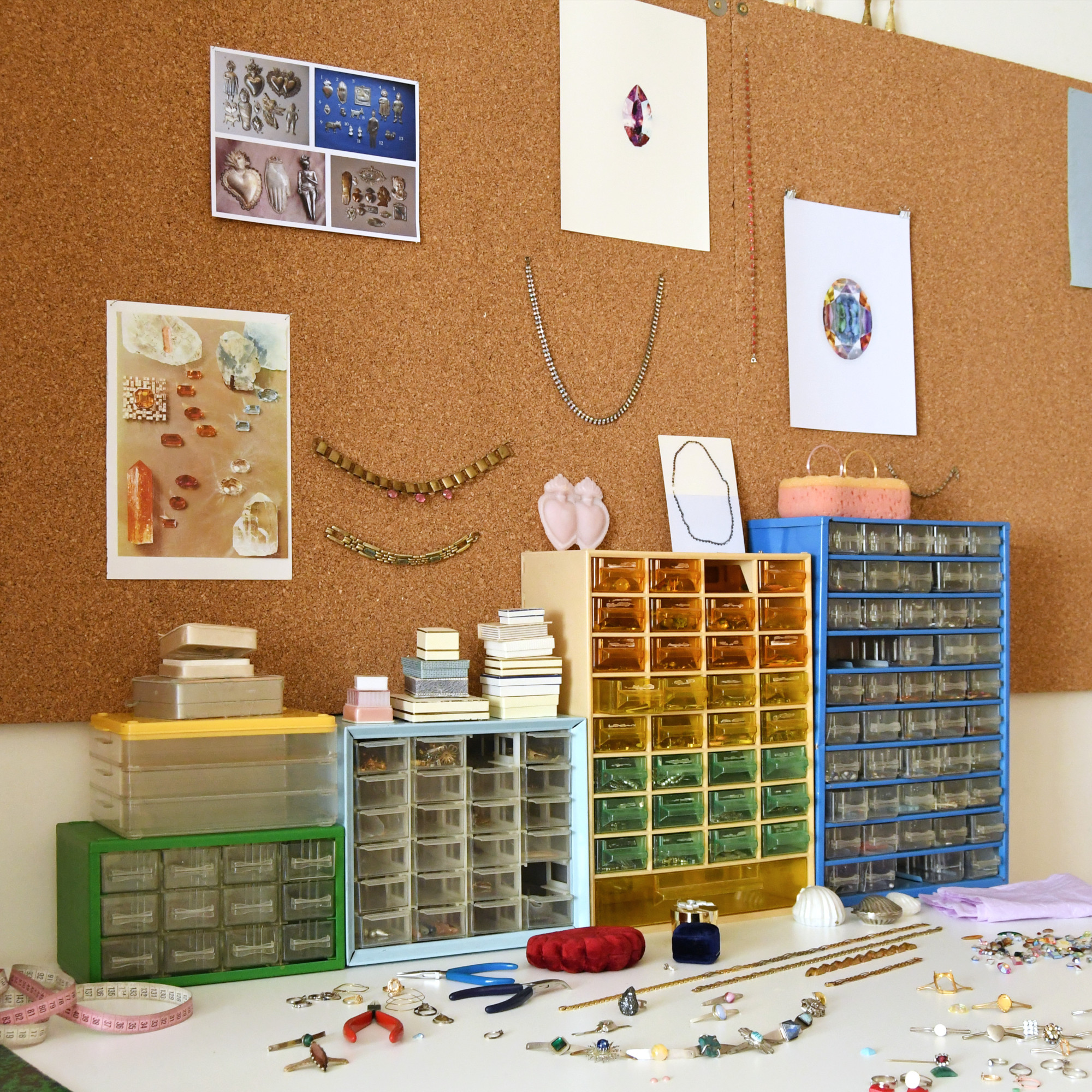Her work explores the space between precious and non-precious, fake and authentic, trash and treasure, in a playful way. The chance element of the lucky find plays an essential role in the process, and the act of collecting determines her working rhythm. By combining jewellery and objects with two-dimensional media such as collage and printed matter, she allows unique materials to reappear in multiple forms.