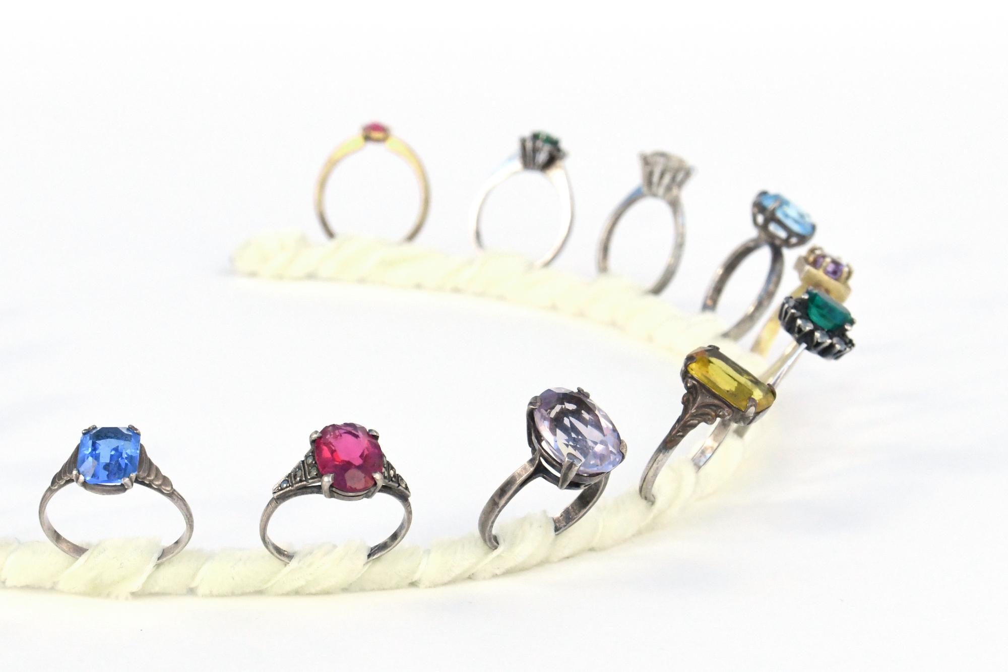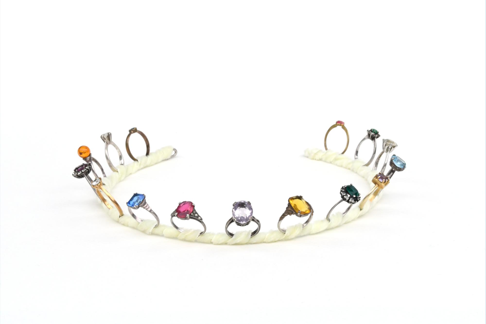 Assemblage / silver necklace, rings (silver, gems, rhinestones, glass), velvet ribbon