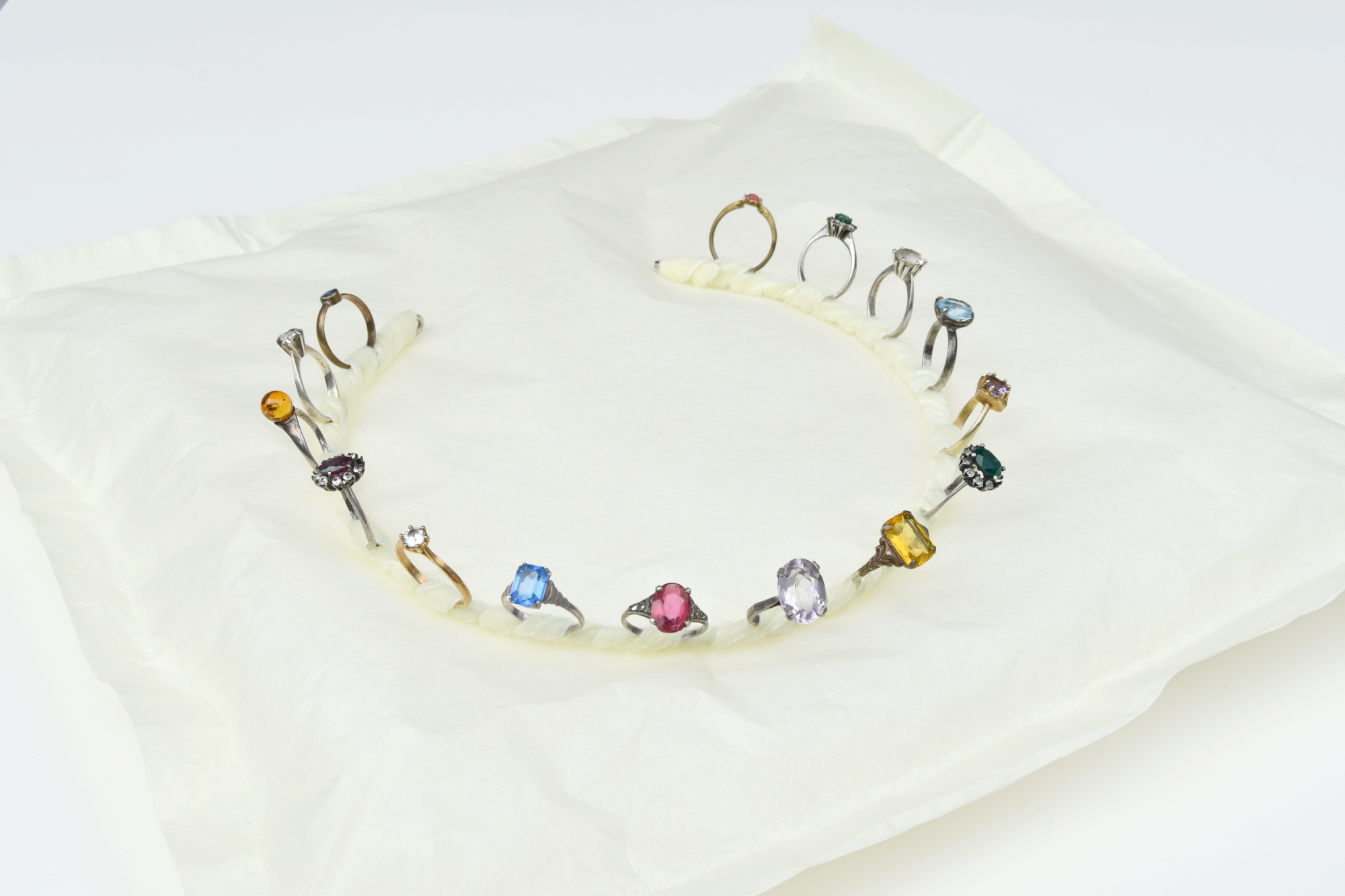 Assemblage / silver necklace, rings (silver, gems, rhinestones, glass), velvet ribbon